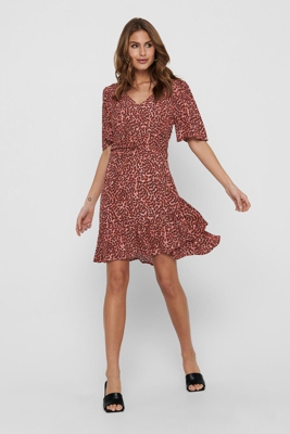 Vestido de manga corta con diseño cruzado con volantes en el bajo y frunces en cintura. Vestido cruzado con volante Only