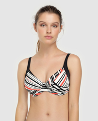 Belcor Top de bikini de capacidad en negro Top de bikini con estampado geométrico en negro y rojo. Cierre de broche y con tirante regulable.
