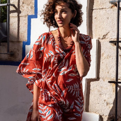 Este caftán es fresco, ligero y elegante, perfecto para ponértelo por encima del bikini o combinándolo con unos tejanos al atardecer.