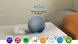 Este lote incluye un Echo (4.ª generación) y un TP-Link Tapo Bombilla Inteligente (E27): todo lo que necesitas para entrar en el mundo del Hogar digital.. Nuevo aspecto, nuevo sonido: el Echo ofrece agudos claros, medios dinámicos y graves profundos, lo que genera un sonido intenso y rico en detalles que se adapta automáticamente a cualquier estancia.. Controla con la voz tu entretenimiento: escucha en streaming música de Amazon Music, Apple Music, Spotify, Deezer y más. También puedes escuchar emisoras de radio y pódcasts.. Lista para ayudarte: pídele a Alexa que reproduzca música, responda a preguntas, narre las noticias, consulte la previsión del tiempo, configure alarmas, controle dispositivos de Hogar digital compatibles y mucho más.. Adéntrate en el mundo del Hogar digital: el controlador integrado te permite configurar sin esfuerzo dispositivos Zigbee compatibles para controlar con la voz luces, cerraduras y sensores.. Llena tu casa de sonido: con la música multiestancia, puedes reproducir música de forma sincronizada desde los dispositivos Echo que tengas en distintas habitaciones. También puedes vincular el dispositivo Echo con un Fire TV para sentir cómo tu entretenimiento cobra vida con un sonido de cine.. Conecta con los que te importan: llama prácticamente a cualquier persona sin usar las manos. Llama a otras habitaciones al instante con Drop In o realiza comunicados a toda la casa para anunciar que la cena está lista.. Diseñado para proteger tu privacidad: fabricado con varias capas de protección y controles de privacidad, incluido un botón que desconecta los micrófonos electrónicamente.
