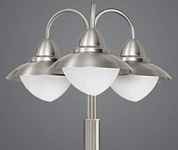 Farola clásica Sydney con tres cabezales de foco La farola Sydney es un elemento de iluminación elegante para la finca e ilumina de manera impecable en cuanto se hace de noche. Las tres pantallas de filigrana curvadas hacia abajo en el mástil proporcionan una luz antideslumbrante. Las luces de tres brazos robustos en acero inoxidable y vidrio opalino blanco están equipados con un tipo de protección IP44 para que la lluvia y los pequeños elementos extraños no supongan ningún problema. La altura es de 220 cm. Grado de eficiencia energética:A++