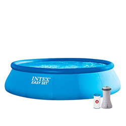 Piscina desmontable Intex con aro superior hinchable, tiene capacidad para 12.430 litros/agua. Incluye: depuradora de cartucho de 3.785 litros/hora con filtro Tipo A; tiempo depuración: de 4 a 5 horas. Sistema de aireación Hydro Technology: mejora la filtración, aumenta la pureza del agua y mejora la cantidad de iones negativos sobre la superficie del agua. Incluye un tapiz, un cobertor de vinilo resistente y una escalera de seguridad para piscinas con una altura máxima de 107 cm. Fácil instalación: extender sobre terreno firme y nivelado, inflar el anillo superior y llenar con agua