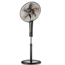 Es más duradero y no se desvanece fácilmente, y si hay manchas, simplemente límpielo con un paño húmedo, siempre manténgalo limpio.. Las 3 configuraciones de velocidad y el diseño del temporizador de 7.5 horas le permiten personalizar sus necesidades de brisa en su casa, sala de estar y oficina.. También tiene un pequeño control remoto, por lo que puede configurar la oscilación del ventilador, la velocidad del viento y el modo natural.. Ventilador de pie con aspas oscilantes con oscilación automática y regulable en altura y ángulo vertical.. El ventilador de pedestal está equipado con un motor más potente y aspas de alta calidad.