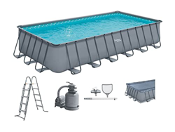 732 x 366 x 132 cm, exterior, estructura de acero antióxido, revestimiento de PVC ultrarresistente, montaje de 60 pulgadas, con accesorios. Capacidad de agua al 80% aproximadamente 20.000 l, para toda la familia