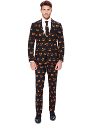 Este traje es de la marca Opposuits™ e incluye chaqueta, corbata y pantalón (camisa y zapatos no incluidos). La chaqueta es negra con dibujos de calabazas sonrientes. Se cierra con botón. El pantalón tiene el mismo estampado que la chaqueta y se cierra con cremallera y botón. Se puede utilizar con cinturón. La corbata completa el traje. Sé el más elegante de tus fiestas de disfraces Halloween con este traje Opposuits™.