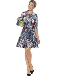 Este traje de Mrs Zombie para mujer es ideal para Halloween. Incluye un vestido y una chaqueta. El vestido sin mangas es corto. La chaqueta es corta. Es un traje para Halloween perfecto para seguir elegante en tu fiesta.