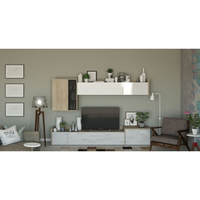 Parete da soggiorno della linea Galleria completa di due pensili, uno orizzontale e uno verticale, e di un mobile porta TV.La struttura solida e resi…