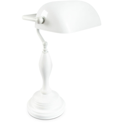 Questo modello di lampada in stile un pó vintage, che ricorda quei faretti da scrivania anni 30 che usavano nei film e che si vedevano nelle banche, è dotato di una base bianca in legno laccato e di un paralume in vetro bianco. La lampada ha un altezza di ca. 45 cm e un diametro di ca. 16 cm. La parte inferiore è dotata di gommapiuma che dá una certa stabilità alla lampada sul tavolo. Inserire la lampadina con attacco E27 e potenza di 40 watt massimo al suo interno è piuttosto semplice (la lampadina non è inclusa nella fornitura). Anche le lampadine a risparmio energetico possono essere utilizzate. Gli elementi decorativi non sono inclusi nella confezione.