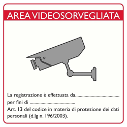 Cartello video sroveglianza con dicitura "Area Videosorvegliata". Conforme ai decreti in vigore sulla videosorveglianza nei luoghi pubblici. Caratteristiche Dimensioni 16cm per 16 cm Materiale plastico rigido Resistente alle intemperie Uso esterno
